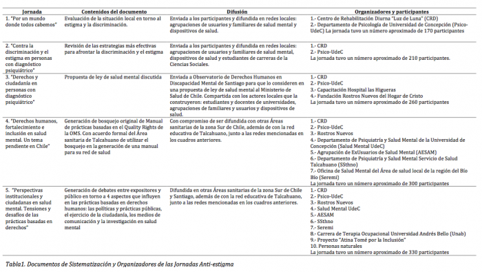 Tabla 1: Documentos de Sistematización y Organizadores de las Jornadas Anti-estigma