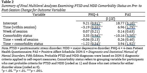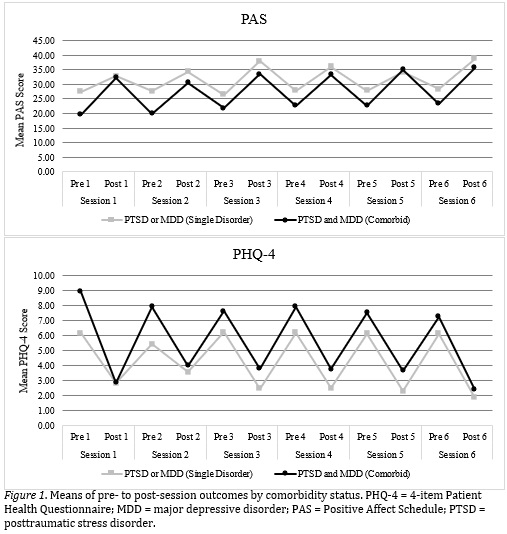 For both outcomes, a significant main effect of time indicated that across all participants, outcomes improved from pre- to post-session (ps < .001). That is, on average, depression/anxiety symptoms decreased from pre- to post-session, and positive affect increased. The main effect of comorbidity status was also significant for both outcomes, indicating that overall, participants with comorbid PTSD and MDD endorsed greater depression/anxiety (p < .001) and lower positive affect (p = .006) than those with a single disorder.
