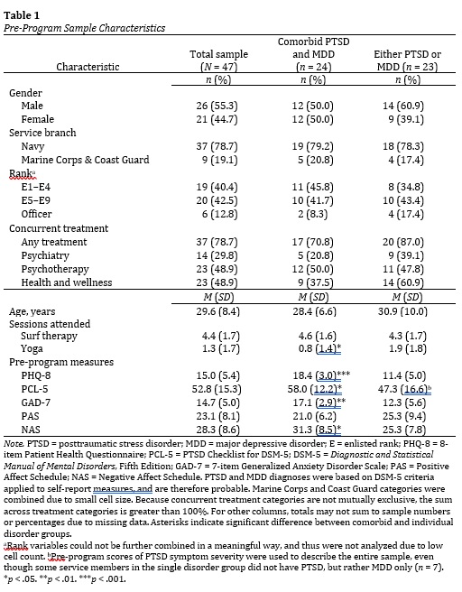 Of the 47 service members in the study sample, 51% (n = 24) met criteria for both PTSD and MDD, and 49% (n = 23) met criteria for only one disorder (PTSD, n = 16; MDD, n = 7). Table 1 ( to see Table 1, download the PDF version to access the complete article, including Tables and Figures) provides pre-program characteristics as well as program participation characteristics of participants in each group. The groups did not differ in demographic or military characteristics, the use of concurrent treatment, or the mean number of surf therapy sessions attended, although service members with comorbid disorders attended significantly fewer yoga sessions than those with a single disorder. Significant differences between the comorbid and single disorder groups were evident with respect to the severity of mental health symptoms at pre-program. Compared to service members with either disorder alone, those with comorbid PTSD and MDD endorsed significantly greater symptom severity of depression, PTSD, anxiety, and negative affect ( to see Table 1, download the PDF version to access the complete article, incluiding Tables and Figures). Differences in pre-program levels of self-reported positive affect approached significance (p = .071).