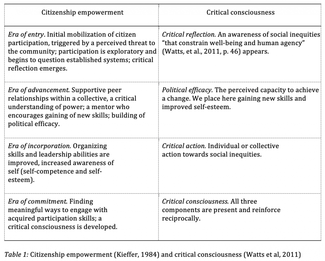 Table 1: Citizenship empowerment (Kieffer, 1984) and critical consciousness (Watts et al, 2011) |