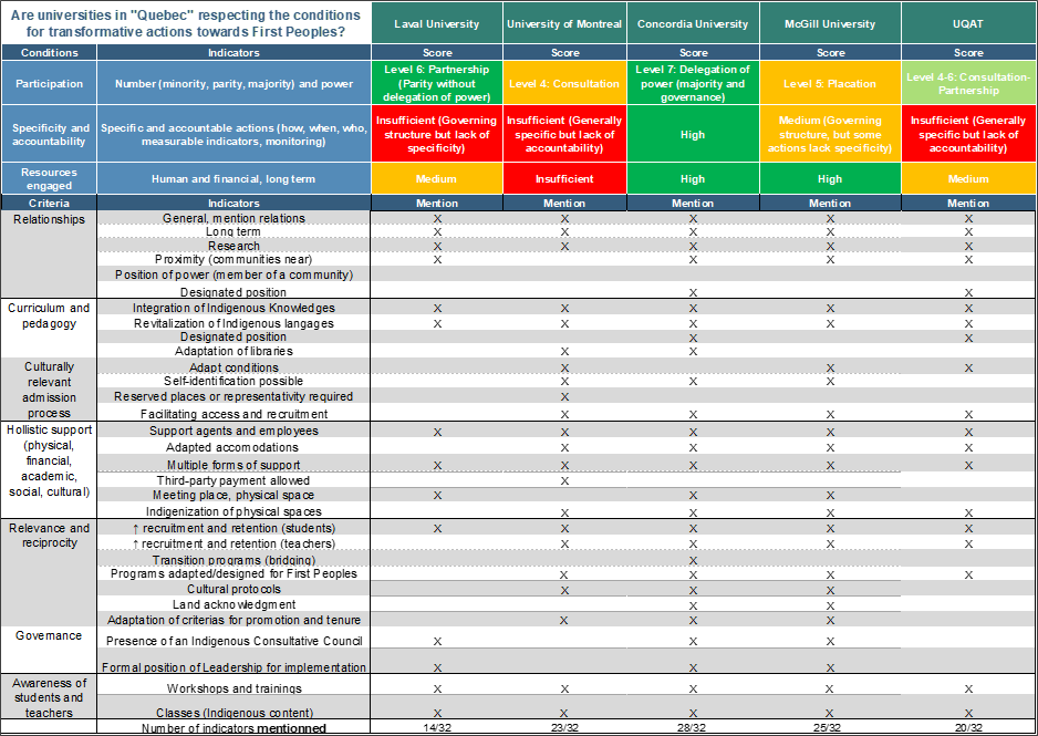 Amongst universities in “Quebec”, Concordia’s First People’s action plan contained the most criteria (28/32), followed by McGill (25/32), University of Montreal (23/32), UQAT (20/32) and Laval University (14/32). Yet only Concordia respects the three conditions for respectful, relevant, reciprocal and responsible institutional action. This means that, although universities mention a lot of actions in their documents, these mentions are unlikely to go beyond intentions.