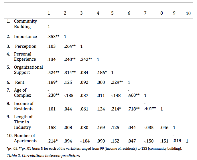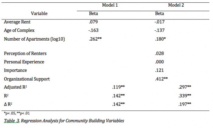 The correlations among variables are listed in Table 2. As expected, the predictor variables are modestly correlated with one another. Out of the four main predictor variables (i.e. importance, perception of renters, personal experiences with community building, and organizational support) only importance that property managers place on community building and the organizational support provided by the management company were significantly correlated with the dependent variable of community building (r=.35 and r=.52, respectively). Of the covariates, two (i.e., age of complex, number of apartments) were significantly associated with community building. These were included in subsequent regression analyses, while the covariates with non-significant relationships with community building were excluded [i.e., average rent, income of residents, and length of time (of property manager) in industry].