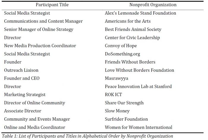 The study was open to any nonprofit actively engaged in the use of social media and the participants in this study were social media strategists in nonprofit organizations. For the purposes of this paper, social media strategists will be operationally defined as the individuals who are responsible for designing, developing, implementing, and monitoring social media efforts in nonprofit organizations. These individuals were purposefully selected because their work in using social media, from an outside perspective, appeared to be actively engaging the organizations’ stakeholders. This study included 15 participants (see Table 1).